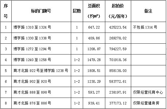 一、拍賣標(biāo)的:杭州市蕭山區(qū)北干街道塘灣名苑沿街商鋪9年租賃權(quán)。商鋪位于杭州市蕭山區(qū)北干街道博學(xué)路、育才北路,總建筑面積約8316.71平方米,共分為8個(gè)標(biāo)的。租賃期內(nèi)免租期3個(gè)月,租金每3年遞增5%,首筆租金為三年一次性支付,第四年起租金一年一付,先付后用。履約保證金為成交價(jià)的一半(不計(jì)息)。具體清單詳見《拍賣文件》。