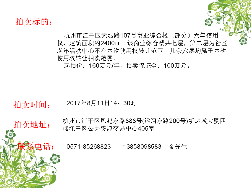 江干區(qū)天城路107號商業(yè)綜合樓(部分)使用權(quán)轉(zhuǎn)讓拍賣