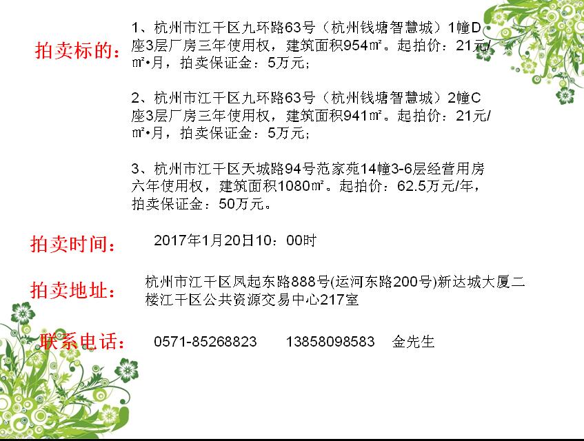 杭州錢塘智慧城標(biāo)準(zhǔn)廠房、范家苑經(jīng)營(yíng)用房使用權(quán)轉(zhuǎn)讓拍賣