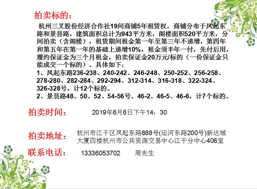 杭州市鳳起東路、景曇路19間商鋪 5年使用權(quán)轉(zhuǎn)讓