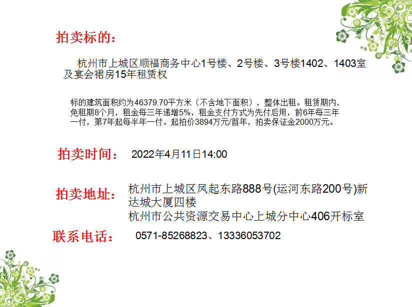 上城區(qū)順福商務(wù)中心1號(hào)樓、2號(hào)樓、3號(hào)樓1402、1403室及宴會(huì)裙房15年租賃權(quán)。